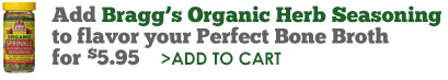 Please note: Our Perfect Bone Broth contains no spices or additives. We suggest adding Braggs Organic spices to flavor the broth or add your own combination of salt and spices. Click here for recipes.