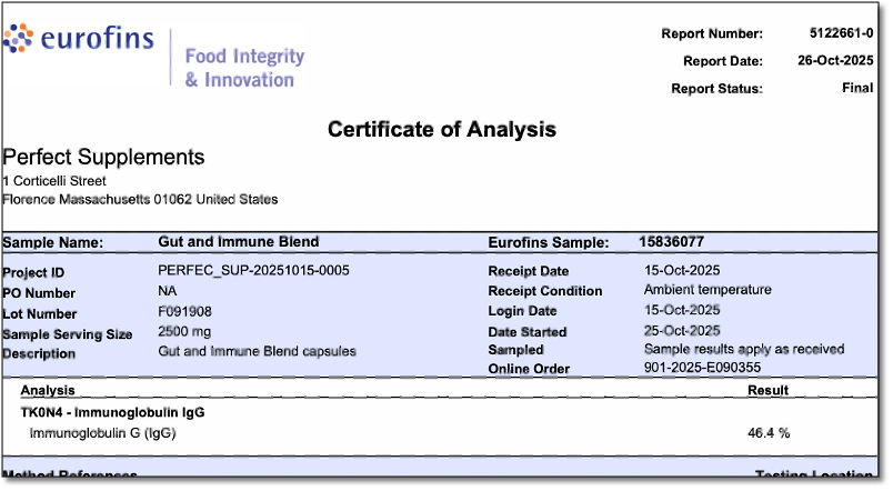 ![]() Independent, third party lab testing showing the Perfect Gut & Immune Blend contains at least 1,000mg of IgG per serving.